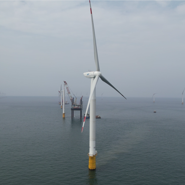 項目自2021年3月29日首臺吊裝至全部完成,建設歷時5個月。項目采用金風科技GW171-6.45MW海上機組,該機型采用直驅永磁技術路線,是金風科技6S產品平臺的代表機型之一,具有并網友好、運行穩(wěn)定、安裝高效、管理智能等優(yōu)點。